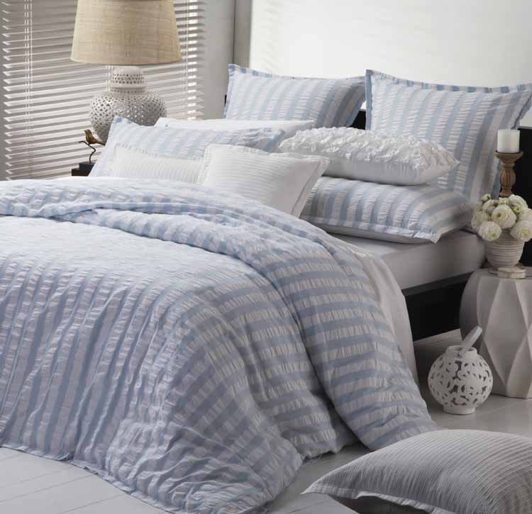 Cabarita Marine Quilt Cover Set by Logan & Mason Platinum Collection features 100% cotton seersucker vertical stripe in white and light blue tones with tailored flange.