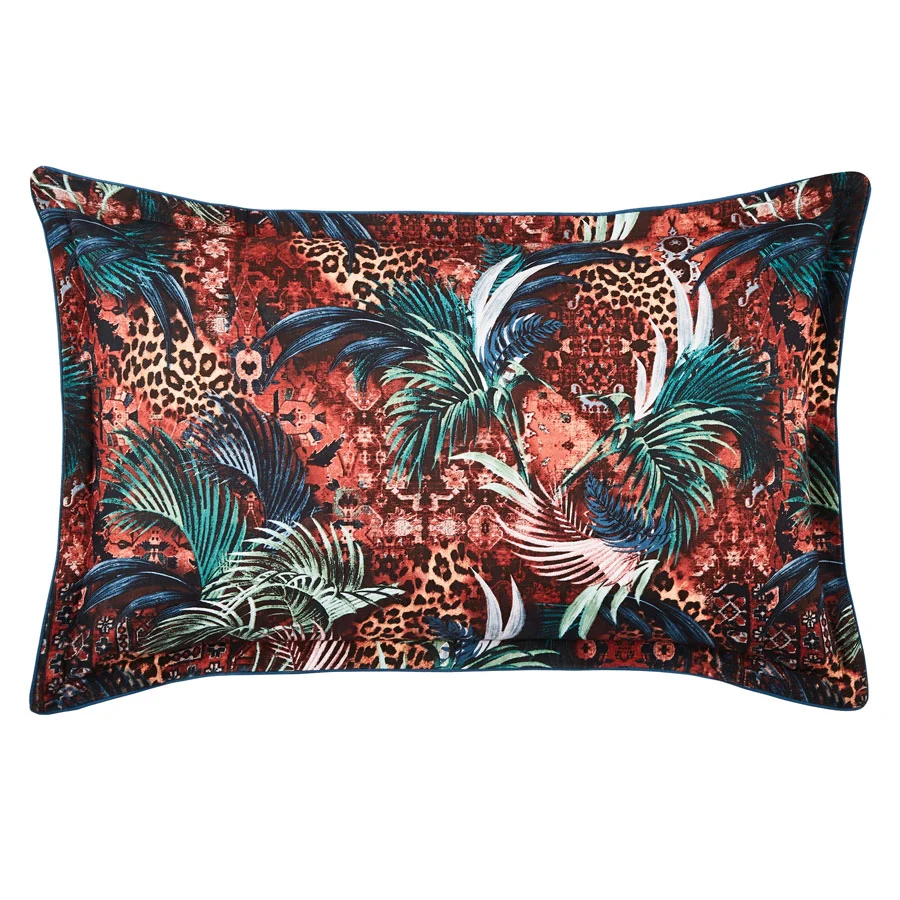 The highly ornate ground of traditional patterns and motifs is enmeshed with lush tropical foliage and hidden exotic animals. The deep red tones of the palette are cooled with tropical blues and green. Piped edges in black complete the look.