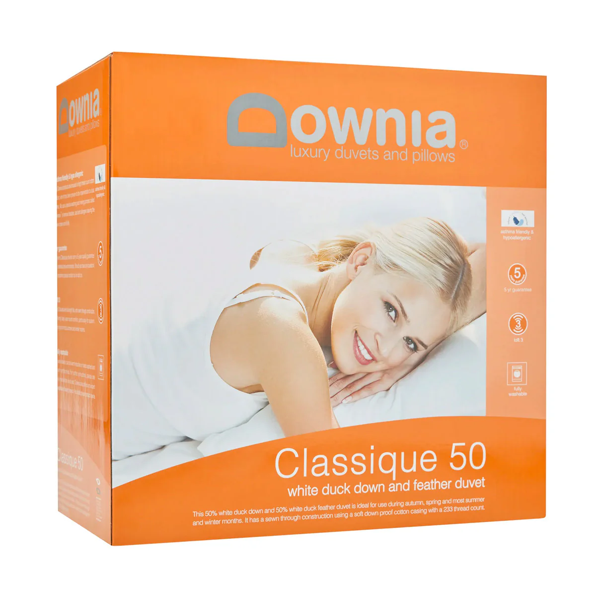 Classique 50 White Duck Down & Feather Quilt by Downia is constructed from luxurious duck down & feathers which offers comfort and warmth due to the ability of down to hold warm air between its millions of tiny clusters. Ā